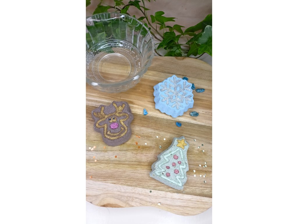 Použité ingredience: hydrogenuhličitan sodný, kyselina citronová, sůl, škrob, přírodní pigmenty a extrakty, bio třpytky.