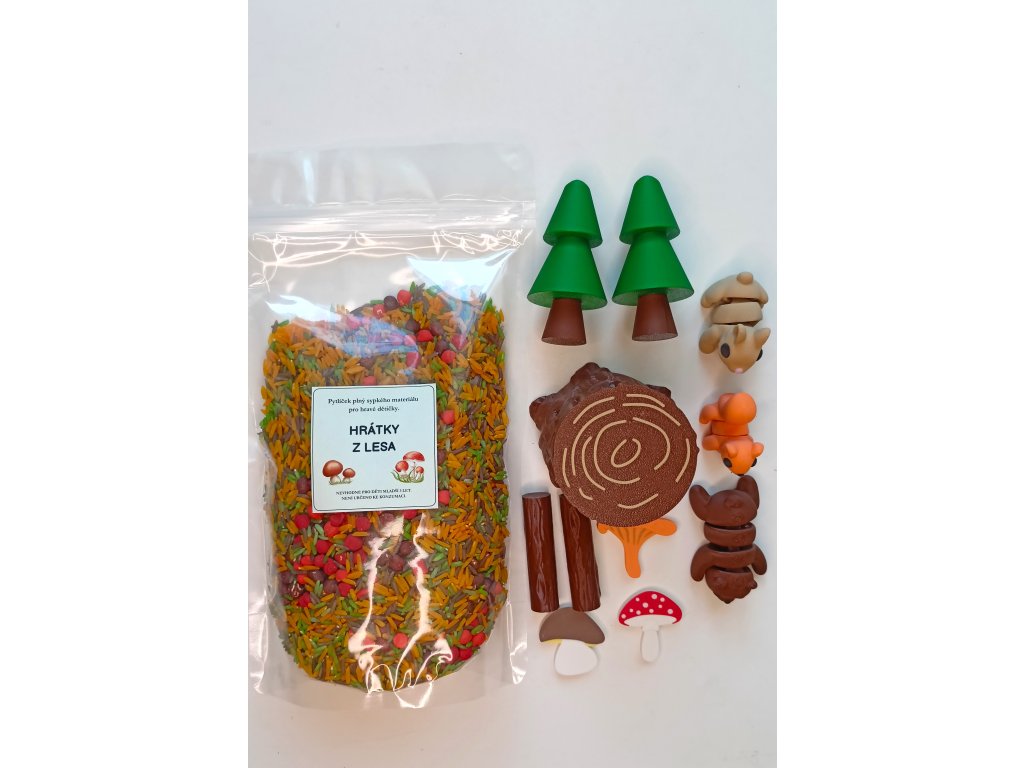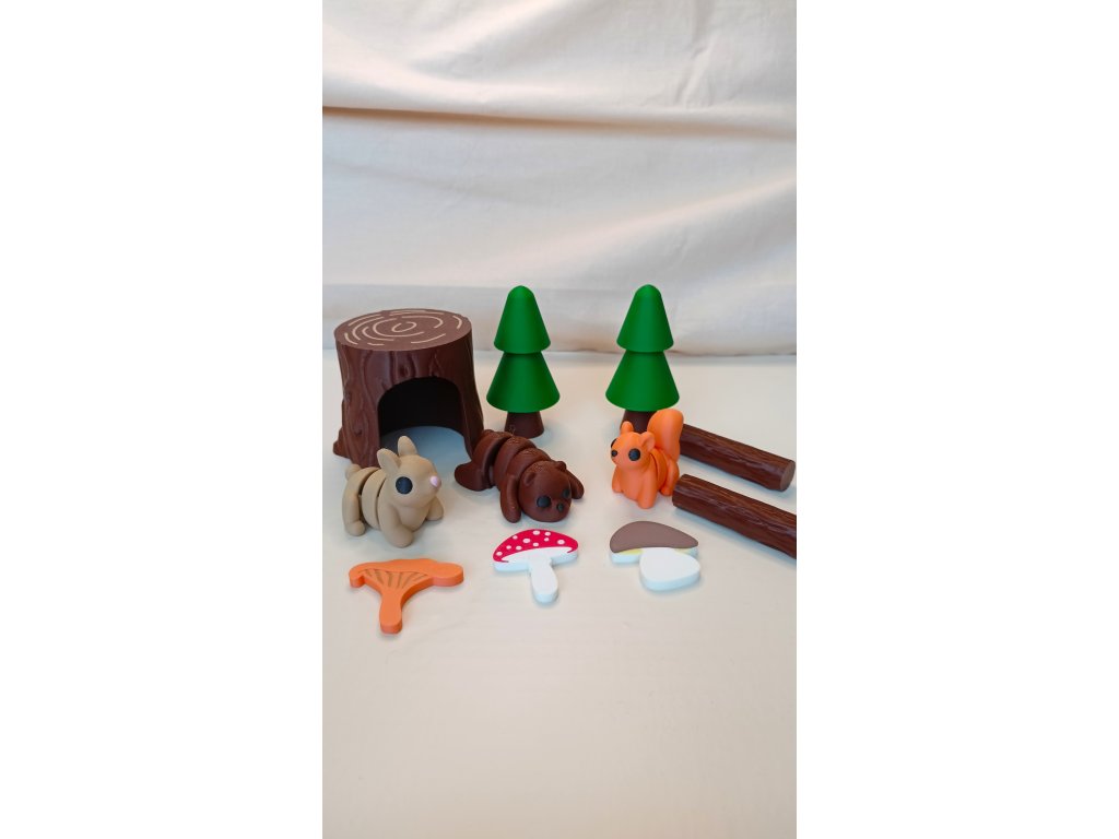 Tato sada je tematicky zaměřená na prostředí lesa. Dutý pařez, stromy, veverka, medvěd a zajíček. Nejen to na vaše děti čeká v tomto tematickém pytlíčku. Nesmí chybět sypký materiál v barvách podzimu. Strom, který rozvíjí koordinaci ruky a oka a umožňuje dětem, aby ho skládaly a procvičovaly šroubování nebo ho využily jen jako rekvizitu ke hře. Tento pytlíček je plný zábavy, učení a objevování.