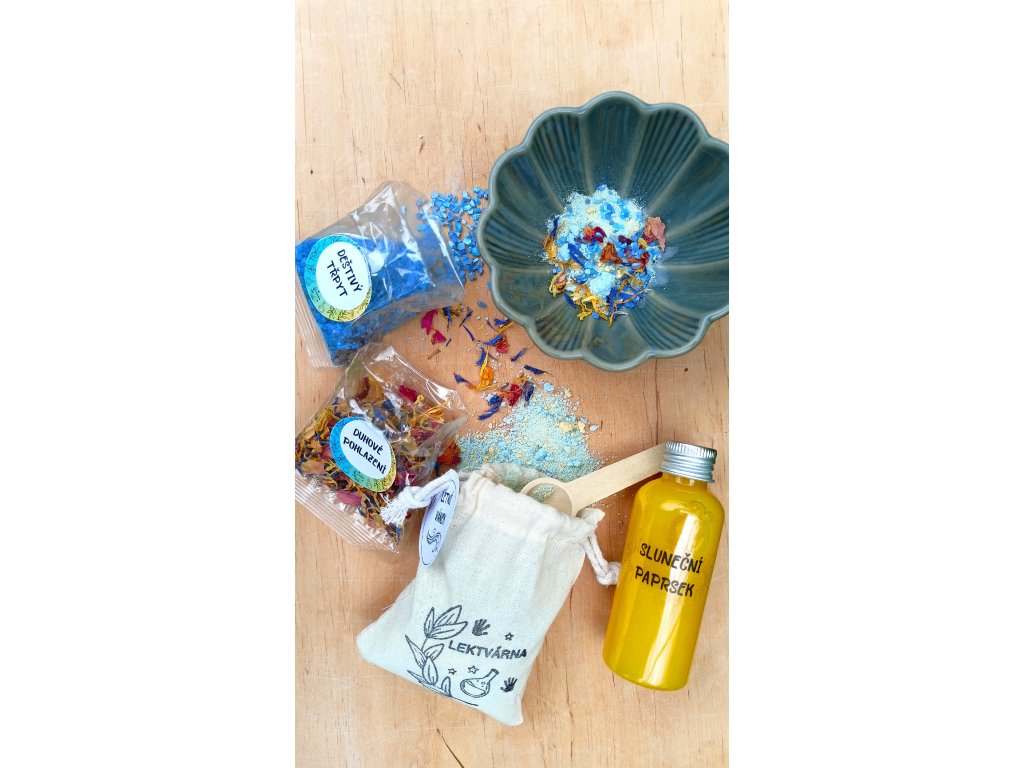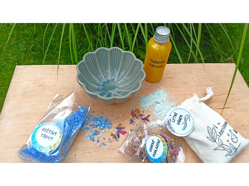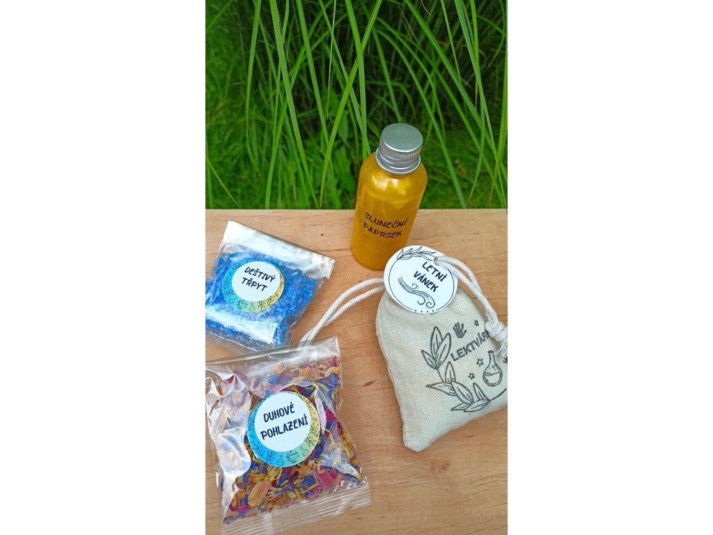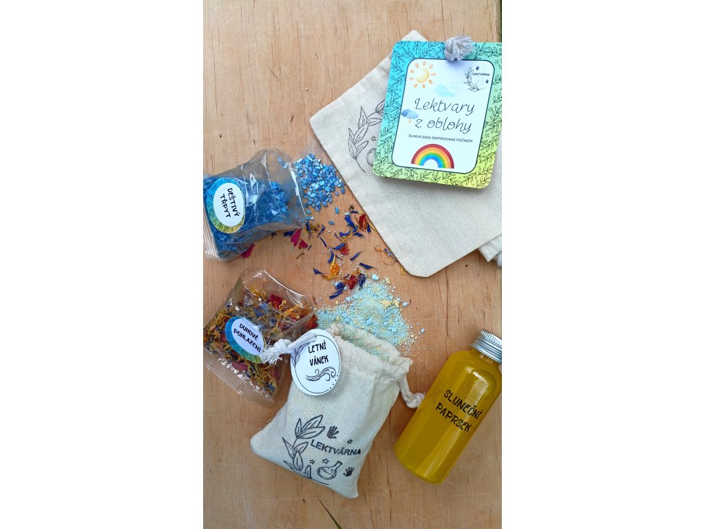 Lektvarová sada inspirovaná tematikou počasí. Stačí jedna kapka tekutiny a šumivý prach ti začne šeptat tichým šuměním. Každé dítě si může vytvořit svůj jedinečný lektvar za využití jednotlivých ingrediencí. Tekutý Sluneční paprsek prozáří lektvar, šumivý prach Letní vánek vesele zabublá, když se potká s tekutinou, po přidání ingredience Duhové pohlazení bude lektvar krásně barevný a ingredience Deštivý třpyt dodá lektvaru jemný třpyt. Rozvíjet dětskou fantazii, smyslové vnímání, přenést děti do světa kouzel a magie, to nabízí naše lektvary. Jako dárek k této sadě dostanete sáček s šumivým prachem Bouřkový mrak.