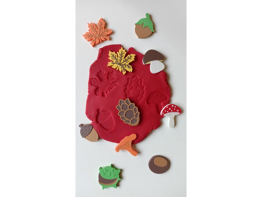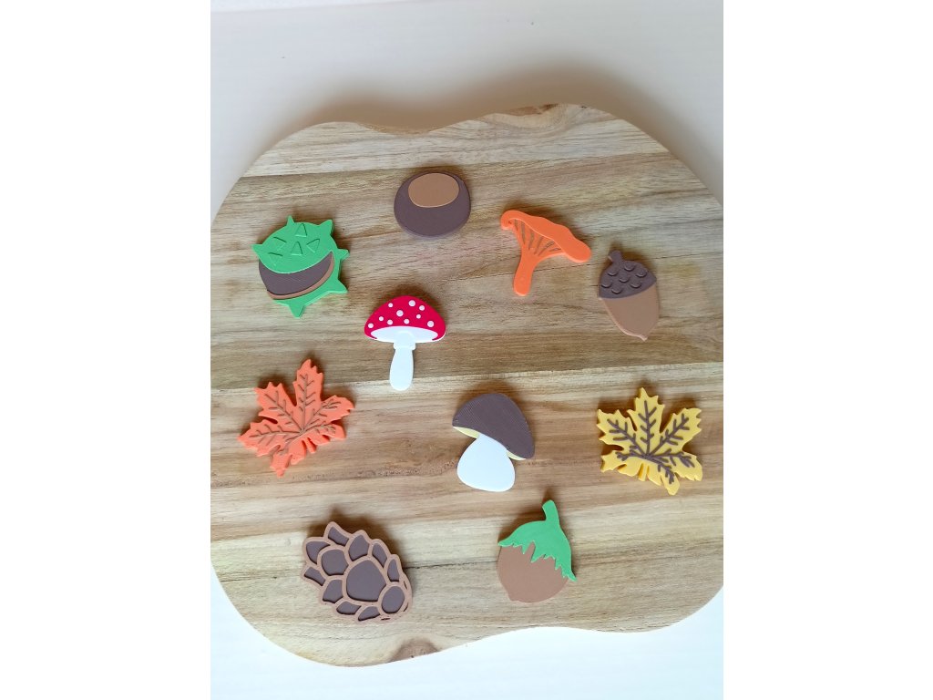Set Podzim obsahuje: 1x lískový ořech, 1x šiška, 1 x oranžový javorový list, 1x žlutý javorový list, 1x kaštan v zelené slupce, 1x kaštan, 1x hříbek, 1x muchomůrka, 1x liška, 1x žalud
