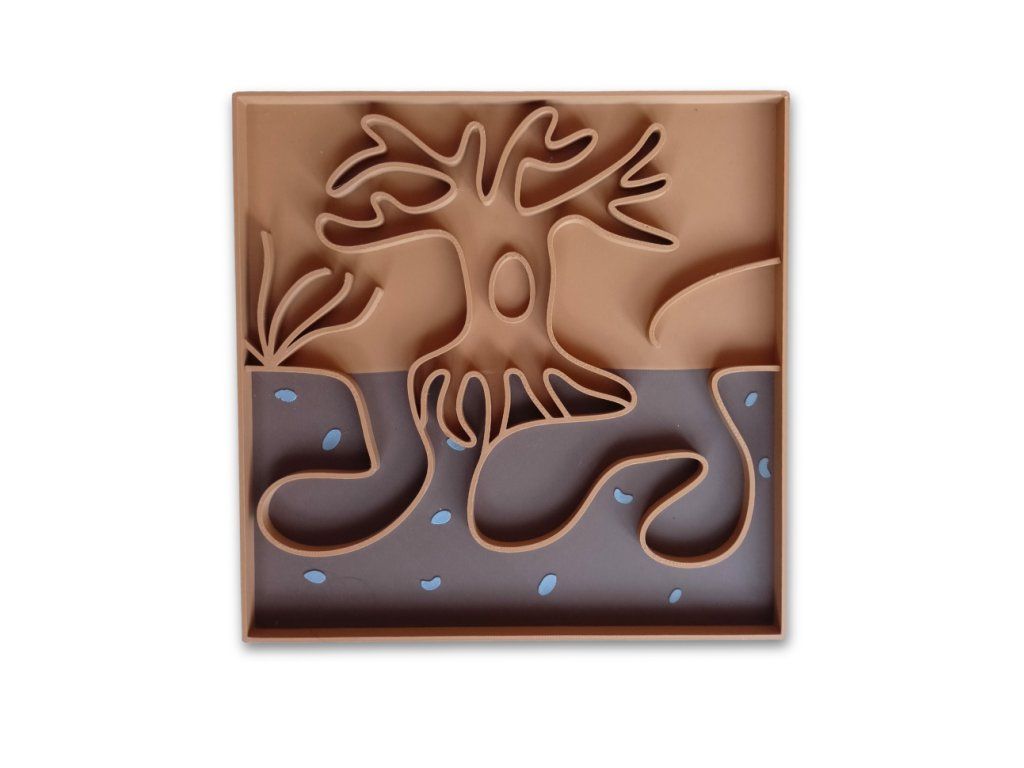 Vysypávací tácek s motivem stromu a podzemí zve děti do světa přírody, kde mají zvířátka své úkryty, cestičky a místa k odpočinku. Horní část tácku představuje strom a jeho korunu, keř a malou jeskyňku, spodní část pak podzemí s chodbičkami a skrýšemi.
